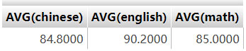 練習1:使用AVG():輸出各科目的平均分數 指令:SELECT AVG(chinese),AVG(english),AVG(math) FROM student 通常會用AS別名來輸出欄位