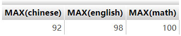 練習3:使用MAX():輸出各科目最高分 指令:SELECT MAX(chinese),MAX(english),MAX(math) FROM student