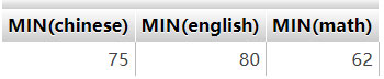 練習4:使用MIN():輸出各科目最低分 指令:SELECT MIN(chinese),MIN(english),MIN(math) FROM student